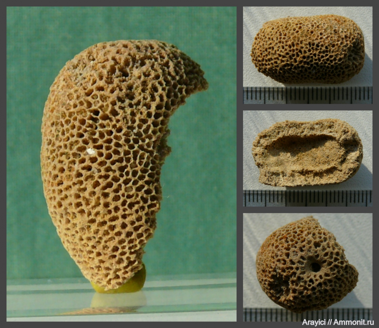Найдена в Радошинском песчаном карьере. Интересно, эта мшанка была чьей-то "шубой" или при жизни просто имела эллипсоидную форму с камерой внутри?