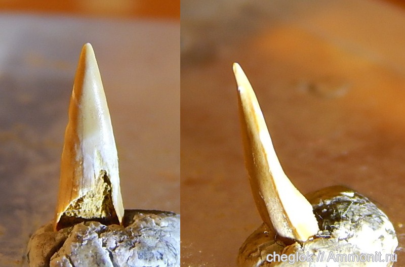 В этом зубе (точнее, коронке), казалось бы,нет ничего необычного, разве кроме расцветки. Но место обнаружения -- карбоновые глины из Гжели, отмой которых мне так любезно предоставил Валентин Горбенко (4GVG). Я так понимаю, это переотложка из более ранних слоёв.Размер стандартный -- 7 мм.