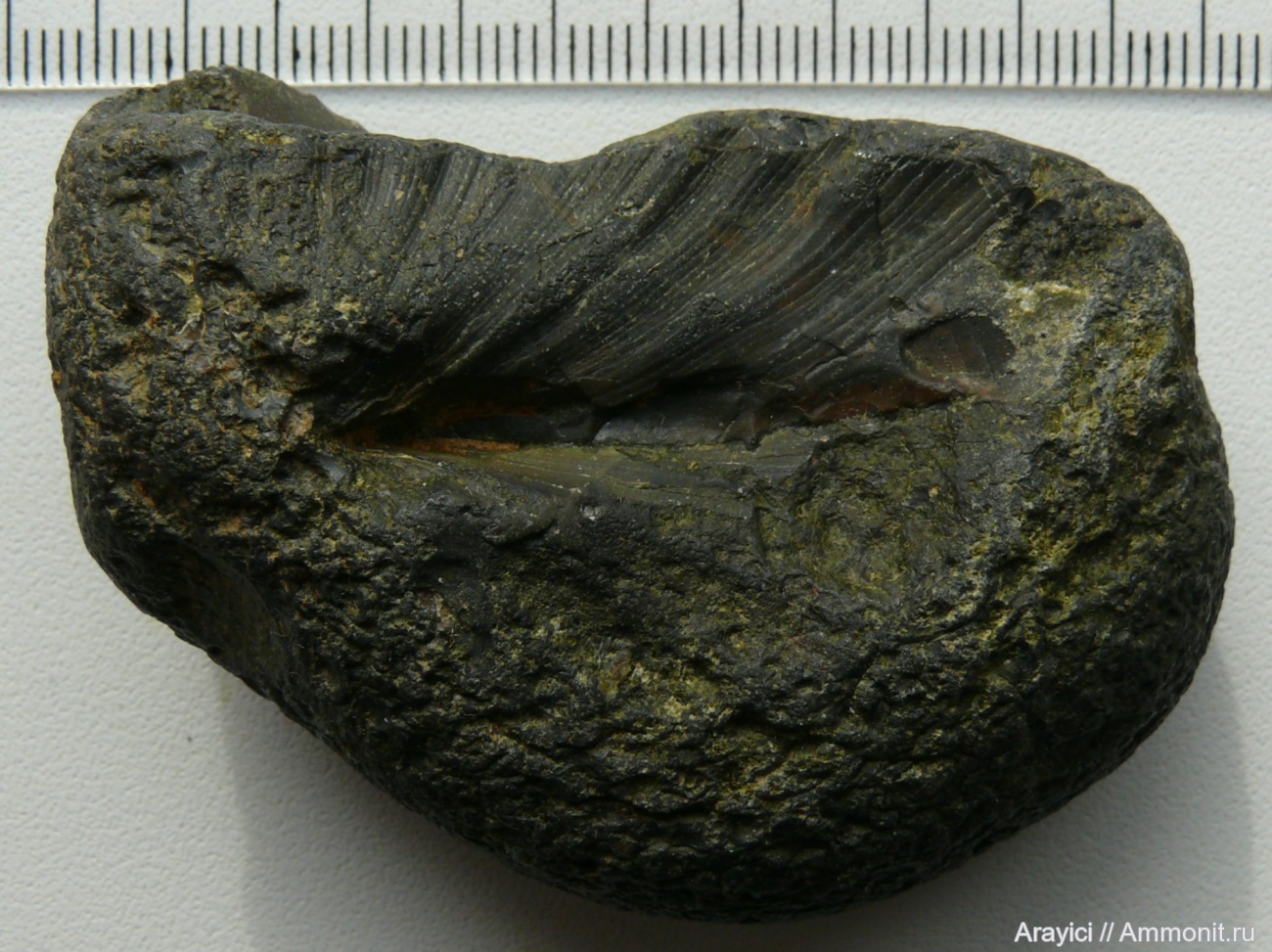 Не раз попадались фрагменты створок иноцерамов с похожим изгибом. Но он начинался от толстого "замка", отпечатка которого здесь не наблюдается. Была конечно мысль, что это осталось от листа растения, но одно дело окаменелое дерево среди морских окаменелостей, а другое отпечаток тонкой листовой пластинки в кремне. | ||||||
