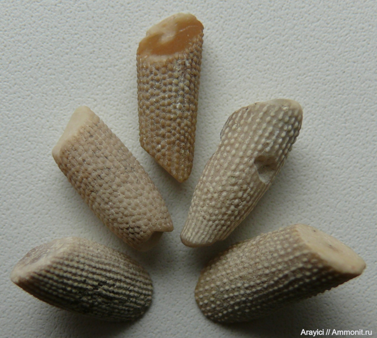 Да каналы рыли в верхнемеловых породах для отвода воды из заболоченных территорий. Вот в "терриконах" из писчего мела, в стенках и на дне таких каналов находил множество подобных фрагментов вместе с другими окаменелостями: фрагментами раковин иноцерамов, рострами белемнитов, члениками морских лилий, ходами серпул и т.д. | ||||||