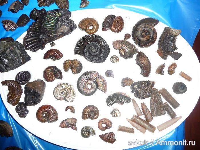 Аммониты, их обломки и отпечатки, найденные в местах выхода верхнеюрских глин в районе Марково. Некоторые найдены в результате раскопок, некоторые были вымыты водой и лежали на мелководье.