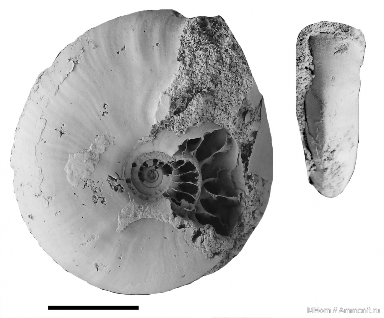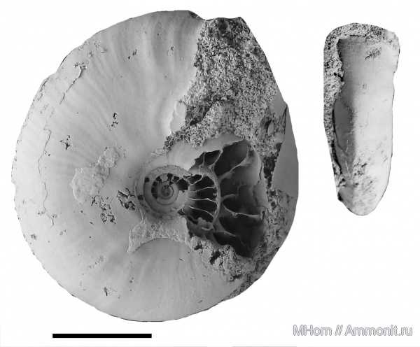 На только что прошедшей Гемме отхватил отличный микроконх древнейшего вида рода Garniericeras - G. interjectum (Nikitin) из базальной части зоны Catenulatum верхневолжского подъяруса р.Черёмухи. У него виден приустьевой пережим, а скульптура сравнительно хорошо развита; и то и другое для гарниерицерасов не очень характерно, но иногда такие кашпуритесовые признаки у них проявляются