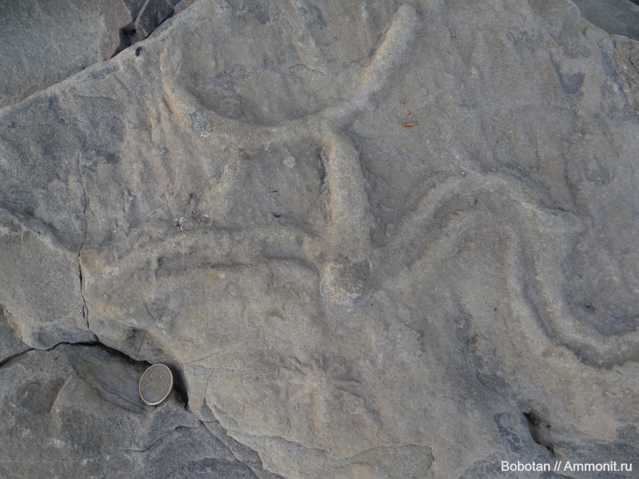 Горизонтальный извивающийся след - Scolicia, след морского ежа. | ||||||