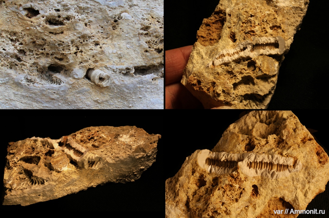 Образец на месте «поимки» (по центру фото). Видны также ругозы и членики морских лилий. Присутствуют брахиоподы («не видны, но они есть»).