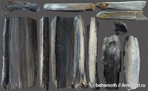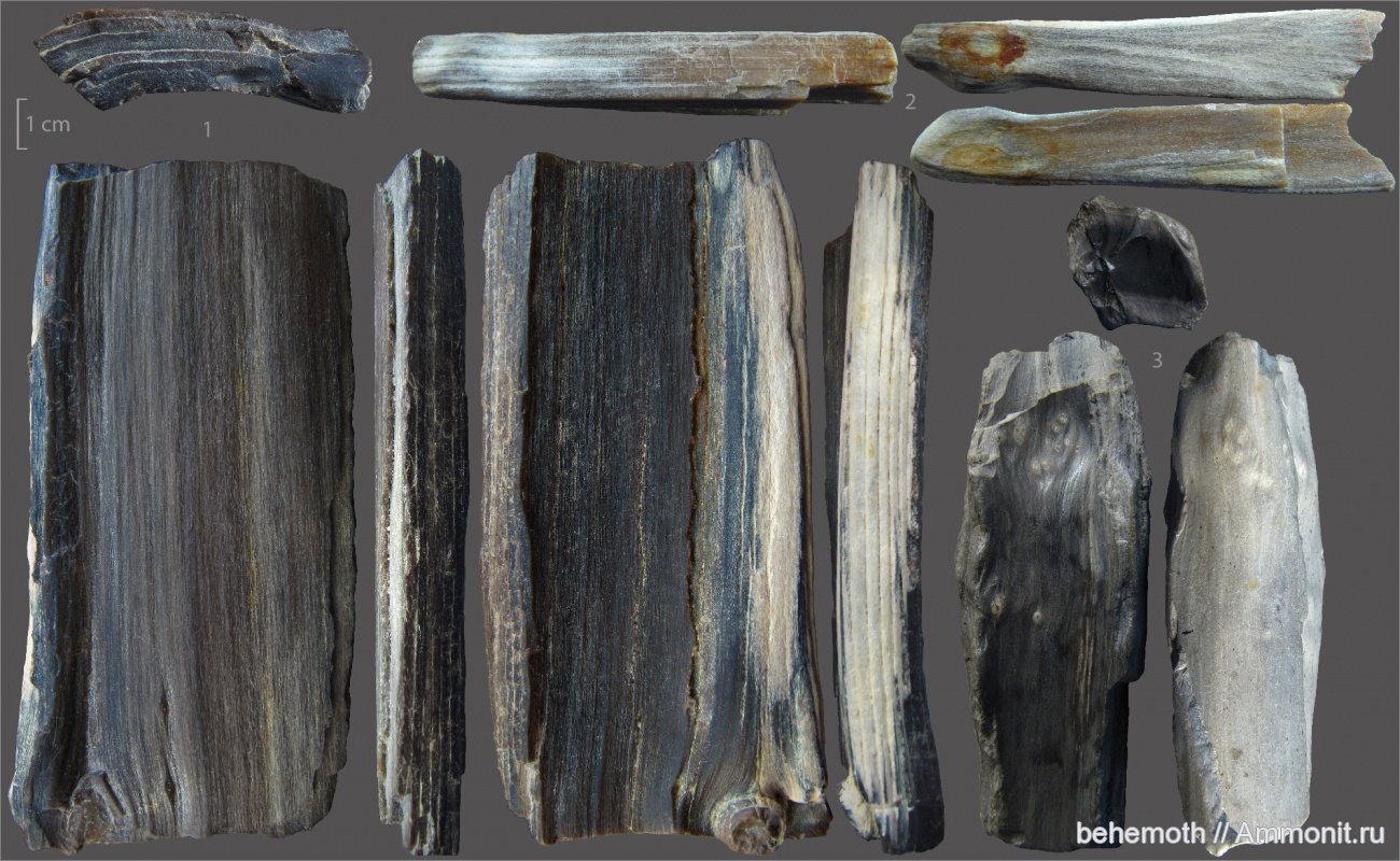 1-2. Находки непосредственно на одном обнажении. Длина большего около 15 см. Примечателен остатком ветви и парой "спящих почек". Меньшая щепка - около 9 см. Просто красивая, просвечивает. =)