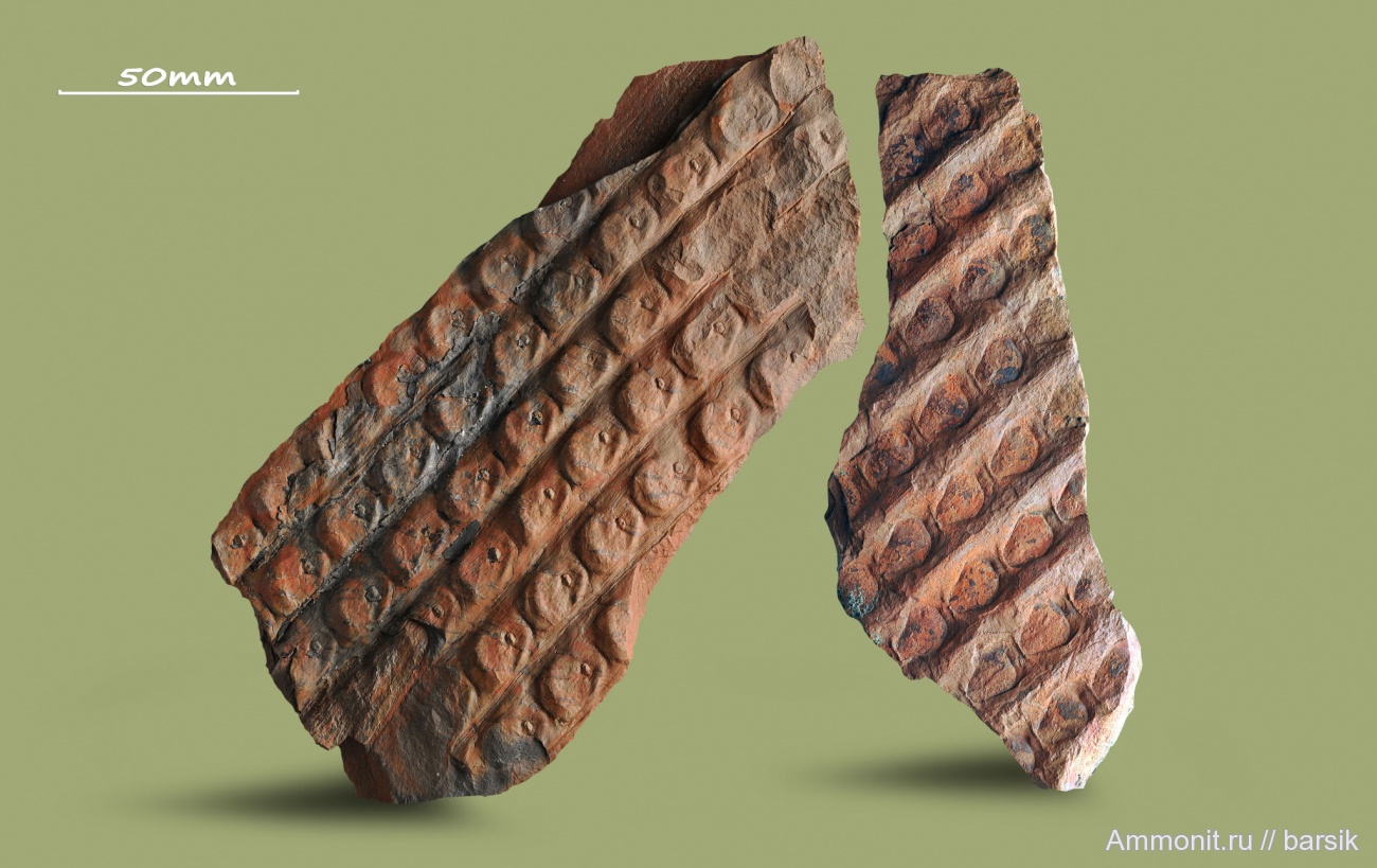 той же Sigillaria mamillaris. Это не одно растение и фрагменты найдены далеко друг от друга, очень странно что за все время поиска еще ни разу ни удалось расколоть плиту на терриконе, чтобы увидеть одновременно и отливку коры и противоотпечаток. Почему то всегда они уже разделены. Наверное, стволы деревьев имеют большой размер, и при разработке в забое комбайн за счет напряжения уже распластывает их по плоскости границы. Вагонетка высыпает на террикон уже разделенные образцы.