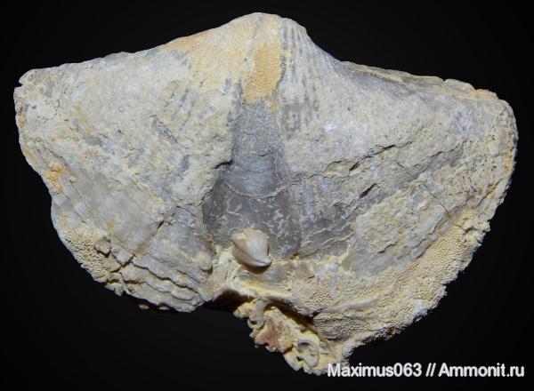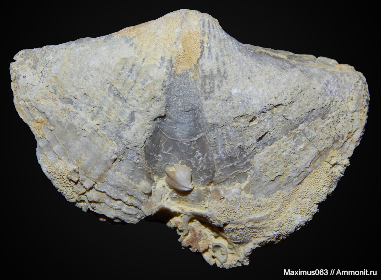 На всякий случай решил написать: эта небольшая брахиопода не приросла к другой брахиоподе, здесь мы видим просто одиночную створку, которая лежит на другой брахиоподе. В девоне такие же попадаются находки: Брахиоподы. Такие явления я называю псевдо-обрастатели. Порой игра природы их маскирует под обрастателей, да так, что есть над чем подумать!