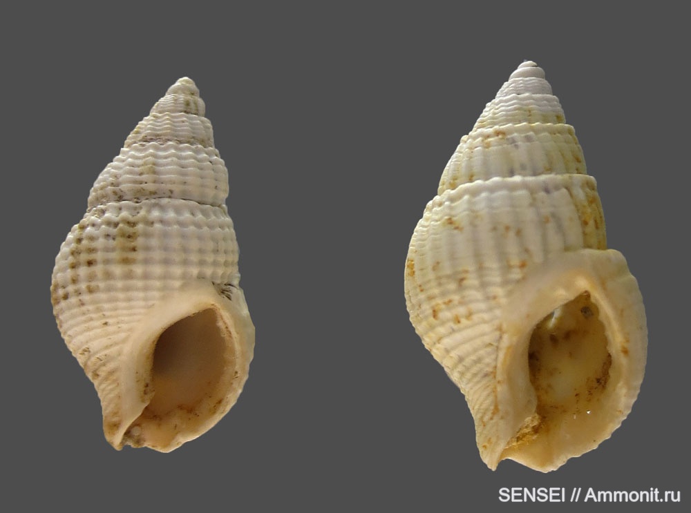 Ну, слева хоть и с более привычной скульптурой так называемых "N. restitutensis" для более высоких горизонтов, но с недосформированным устьем, что не есть хорошо для сравнения с правой раковиной, у которой оно полностью оформленное. А справа отклоняющаяся к стратиграфически более раннему subhoernesi. | ||||||