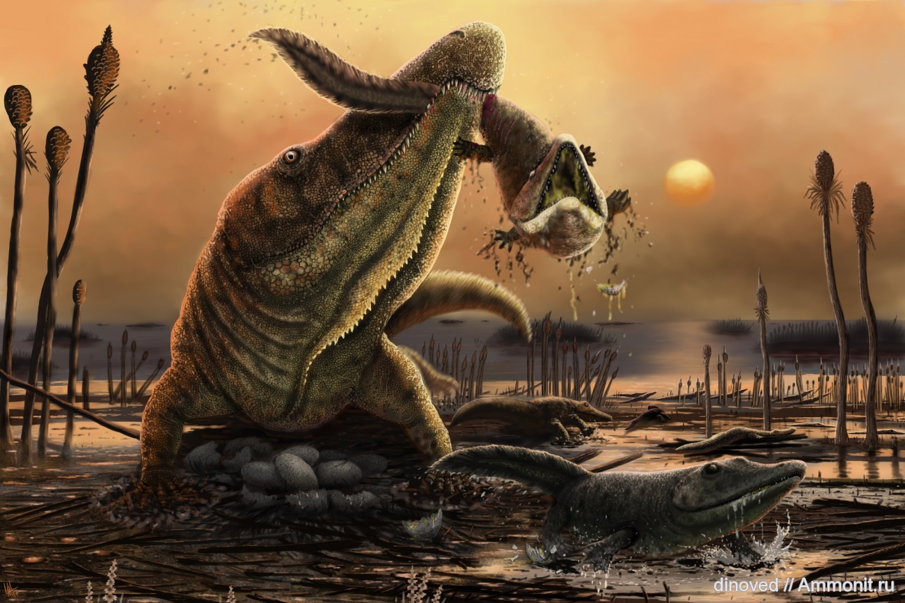 Спасибо, боюсь, мозгов у хасмо на такие хитрые трюки не хватило бы)) эти существа жили инстинктами. Её ошибка в том, что она отлучилась от гнезда вечером, самое время для лабиринтодонтов, днём они прятались от жаркого солнца, подобно современным сомам, и только с наступлением сумерек словно тени бесшумно выползали из под коряг для охоты. Нужно было днём выбирать время для перекуса, пока другие хищника дремлют в тени. | ||||||