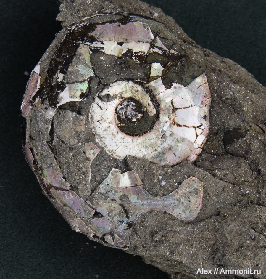 Ушастый микроконх Brightia sp. Хотя сохранность аммонита оставляет желать лучшего, на этом образце замечательно видно ушко с расширением на конце.