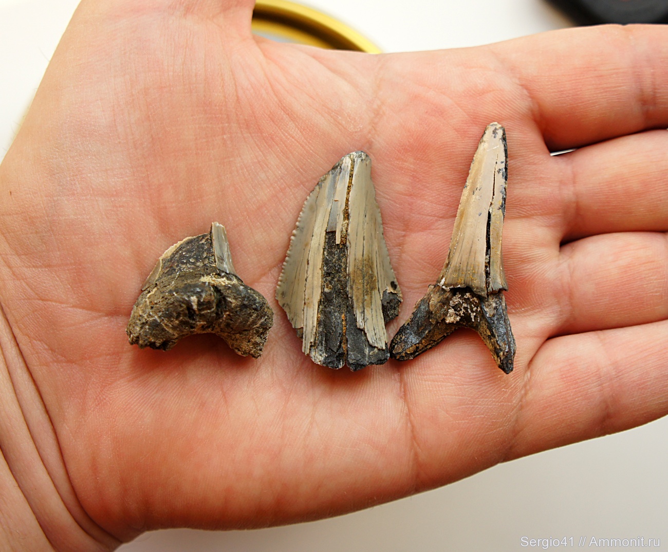 В ладони результат разведки выхода эоценового горизонта. Коронка впечатляющего размера, судя по всему Otodus sokolovi, была найдена вдавленной в грунт, на грунтовой дороге, пересекающей горизонт. Почти целый, но "потрепанный жизнью", 5-ти сантиметровый зуб striatolamia macrota и корень с фрагментом основания коронки, я думаю той же акулы, в самом горизонте. Каков же был полный размер зуба, если его корень больше корня, рядом лежащей, раза в 2?