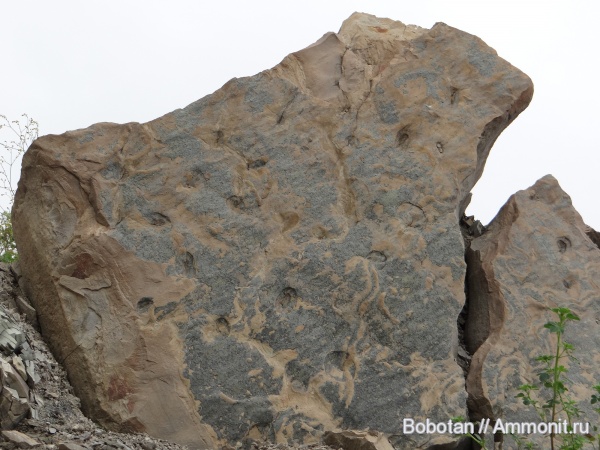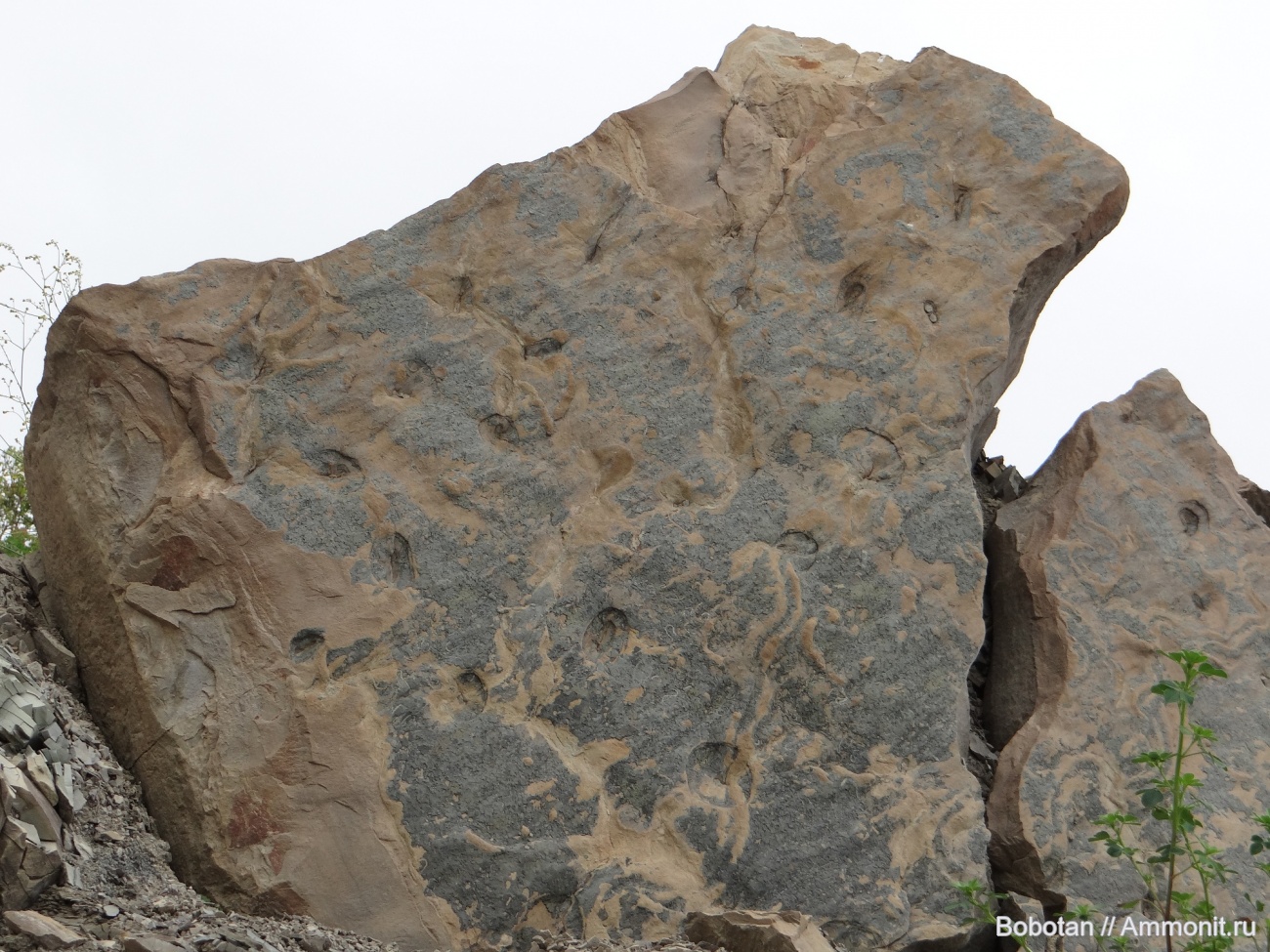 Почти каждая норка Rhizocorallium на этом камне и на многих других камнях побережья,отмечены овальной,часто многоступенчатой вмятиной.