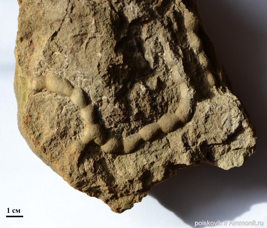 В эрратических валунах Балаклавы изредка встречаются необычные следы жизнедеятельности ископаемых организмов в виде "четкообразных" образований (дополнительно см. Фото). Предположительно - это окаменевшие ходы каких-то илоедов? Просим помощи в определении.