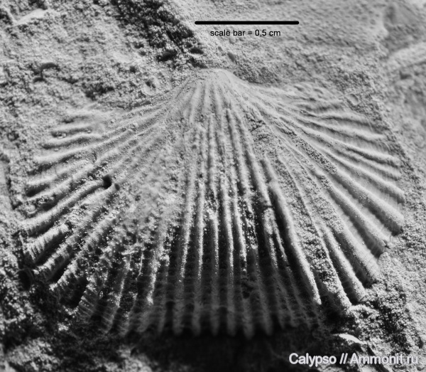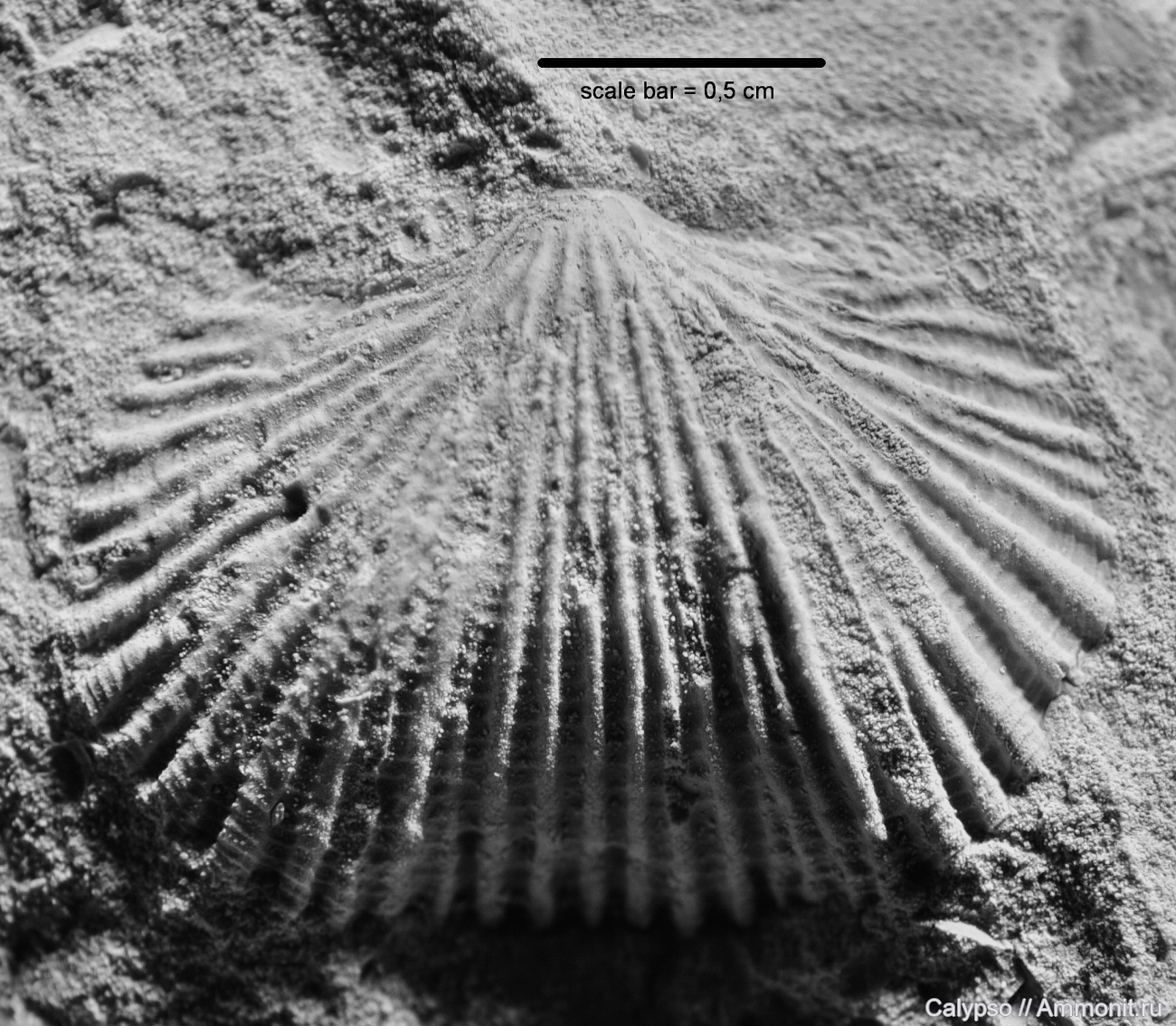 На этот раз попался экземпляр хорошей сохранности всё так-же - в привозном щебне. Створка одна (брюшная), поэтому далее нет смысла расчищать породу. Скульптура раковины представлена радиальными рёбрышками, утолщающимися к переднему краю раковины и с примерно равными промежутками между ними. Дихотомировать первые (расщепляться, делиться надвое) начинают почти у самой макушки, а интеркалировать (включаться, вклиниваться) примерно с середины длины раковины, причём в синусе этого не замечается. Особо отчётливо это можно наблюдать на боковых по краям от синуса. На всей поверхности раковины наблюдается тонкая поперечная штриховка.