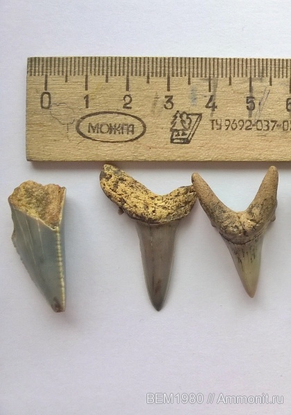 1 - Otodus, видимо из ранних зазубренных, вроде O.auriculatus, 2 - Striatolamia macrota, характерный верхний переднебоковой, 3 - Jaekelotodus trigonalis.