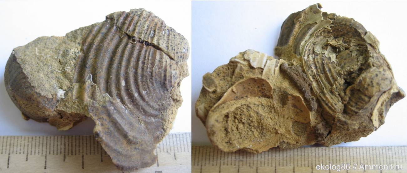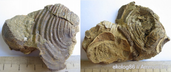По правде образец вообще сложно определим. Скорее всего здесь отпечаток и фрагменты раковин двустворок, возможно еще брахиопод. Вот и все что можно сказать. | ||||||