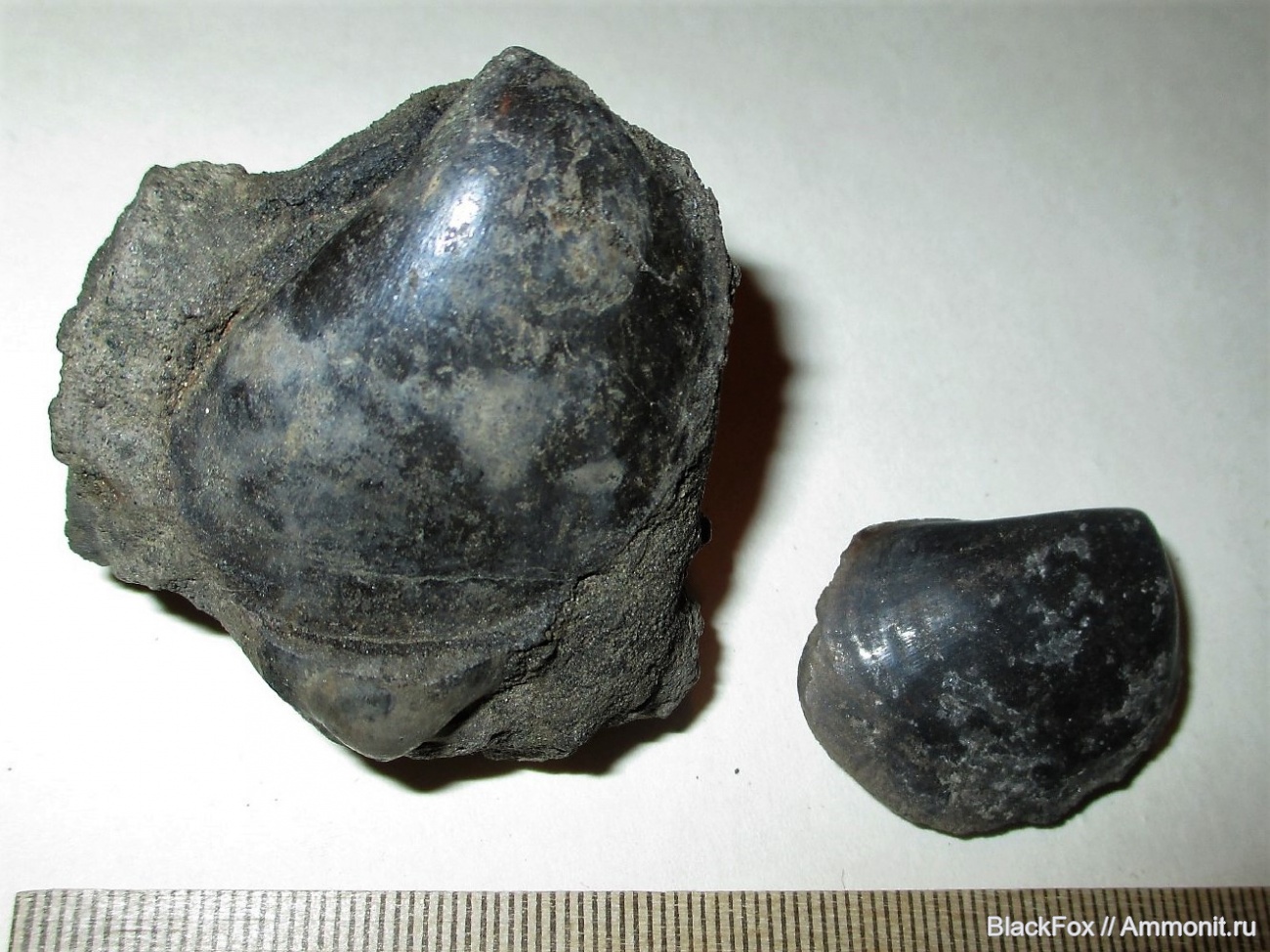 Левый образец, больше на отпечаток похож. Есть осколки от раковины с обратной стороны, но не похоже чтобы одного и того же молюска. Размер раковин слишком разный, хотя вид один. | ||||||