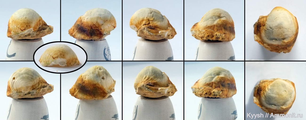 (с учетом сохранности, отсутствующей спинной створки). Смущает несколько больший размер 25 мм (в видовом описании 15-20 мм), и толщина - отколовшаяся часть раковины в области макушки имеет сильно большую толщину (около 3 мм), чем в передней части (в описании написано, что створки тонкие).