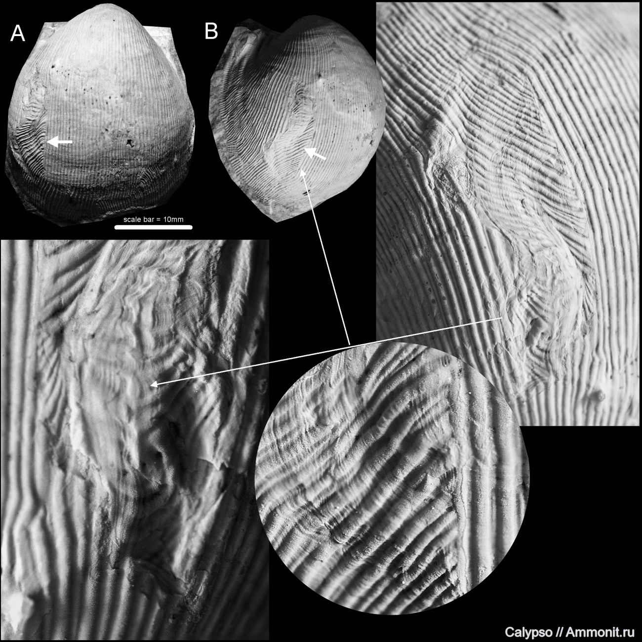 Экземпляр найден (уже по обыкновению сему) в щебёночной отсыпке балластной призмы на ж/д путях. Раковина изначально была скрыта плотной коркой из крепкого известняка. После препарирования моё внимание привлёк небольшой участок с нарушением линейности рёбер на брюшной створке. В данном случае мы имеем дело "с резким повреждением брюшной створки, вызвавшее образование локализованного глубокого "шрама", но не повлиявшего на общую форму раковины" *.