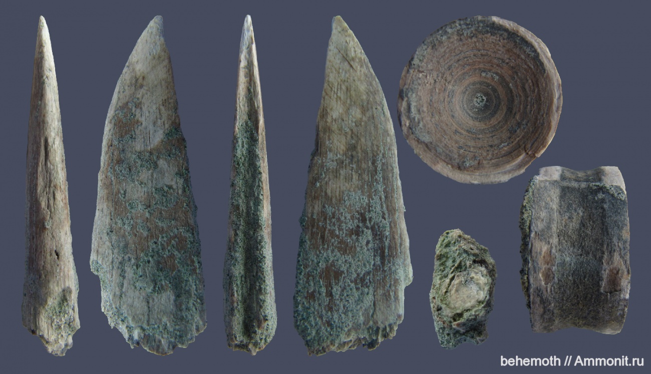 Ростральный зуб и позвонок(ранее я его уже выкладывал на планке позвонков, однако двум останцам одного вида будет разумно находится на одной планке) ископаемого эоценового пилорылого ската (возможно Pristis сf. lathami). Есть еще несколько переотложенных зубов скатов этого рода, по техническим причинам на планку пока не попали =) Как доберусь до них - приложу на эту же планку.