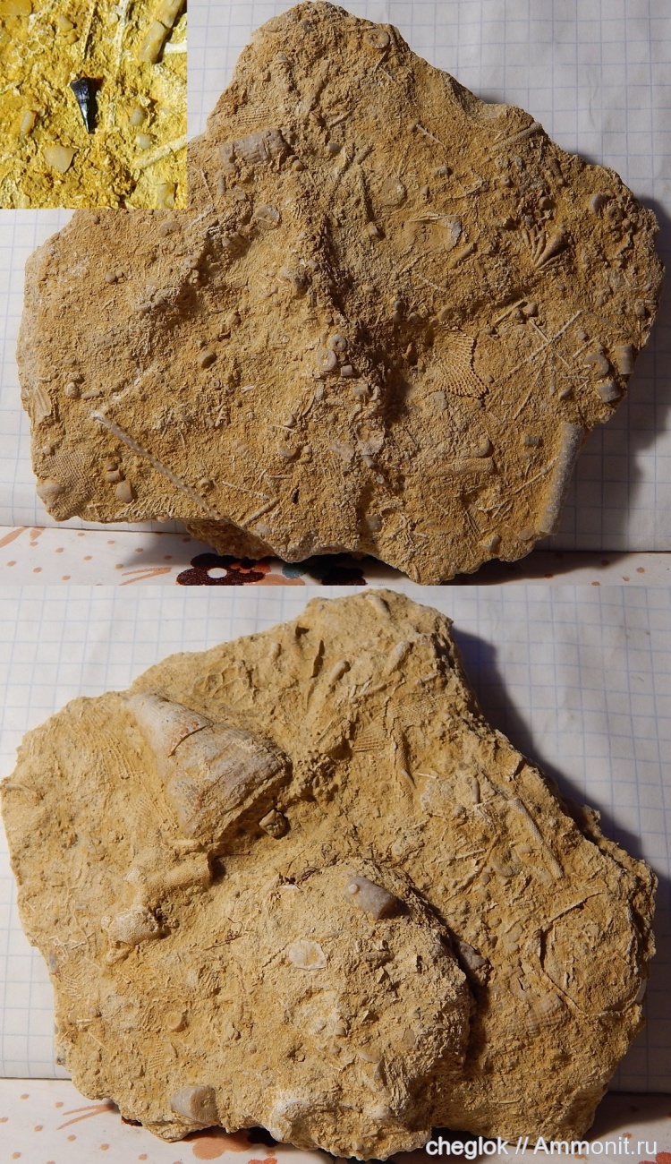 Вчерашняя промывка снова показала, что плитки из слоя могут быть весьма полезны. Эта плитка сама по себе набита фауной, но самое приятное на ней -- зубик размером 3мм, притаившийся на верхнем фото внизу посередине. Размер плитки 12 на 11 см.