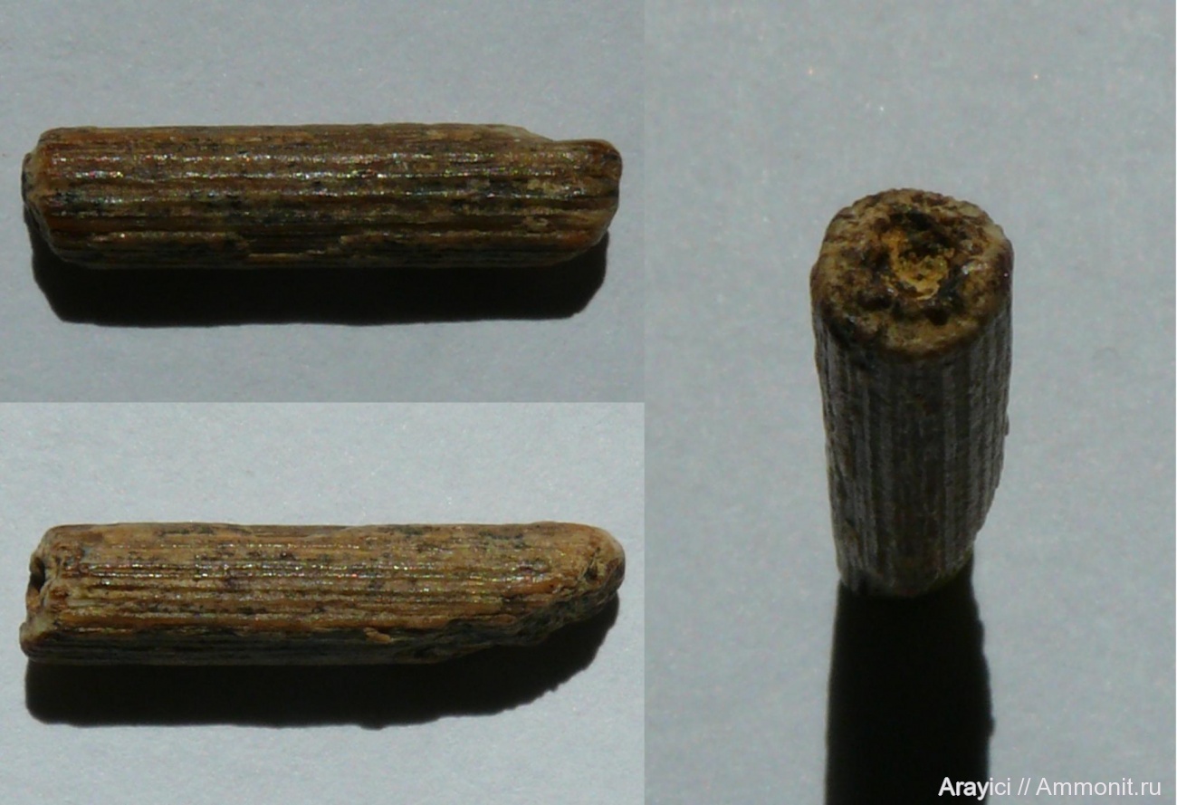 Найден в Радошинском песчаном карьере. На верхнем фото видно, что образцу присуща слоистая структура. Внутренняя полость заполнена частично сцементированной смесью глины, мела и песка. Длина 19 мм, диаметр 4 мм.