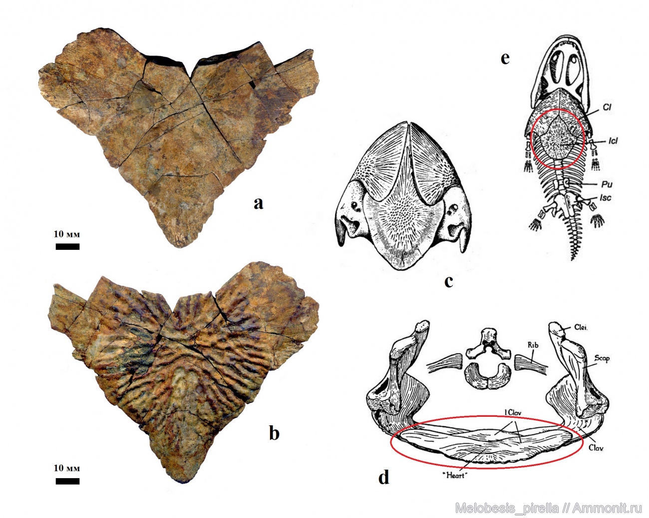 Рисунок "e" - демонстрирует расположение кости в скелете и, соответственно, в плечевом поясе амфибии (вид снизу). На рисунке "с" изображен плечевой пояс (вид снизу) амфибии Benthosuchus sushkini Efremov (Основы Палеонтологии, Том 12, стр.92, рис. 50.). Взят в качестве примера.