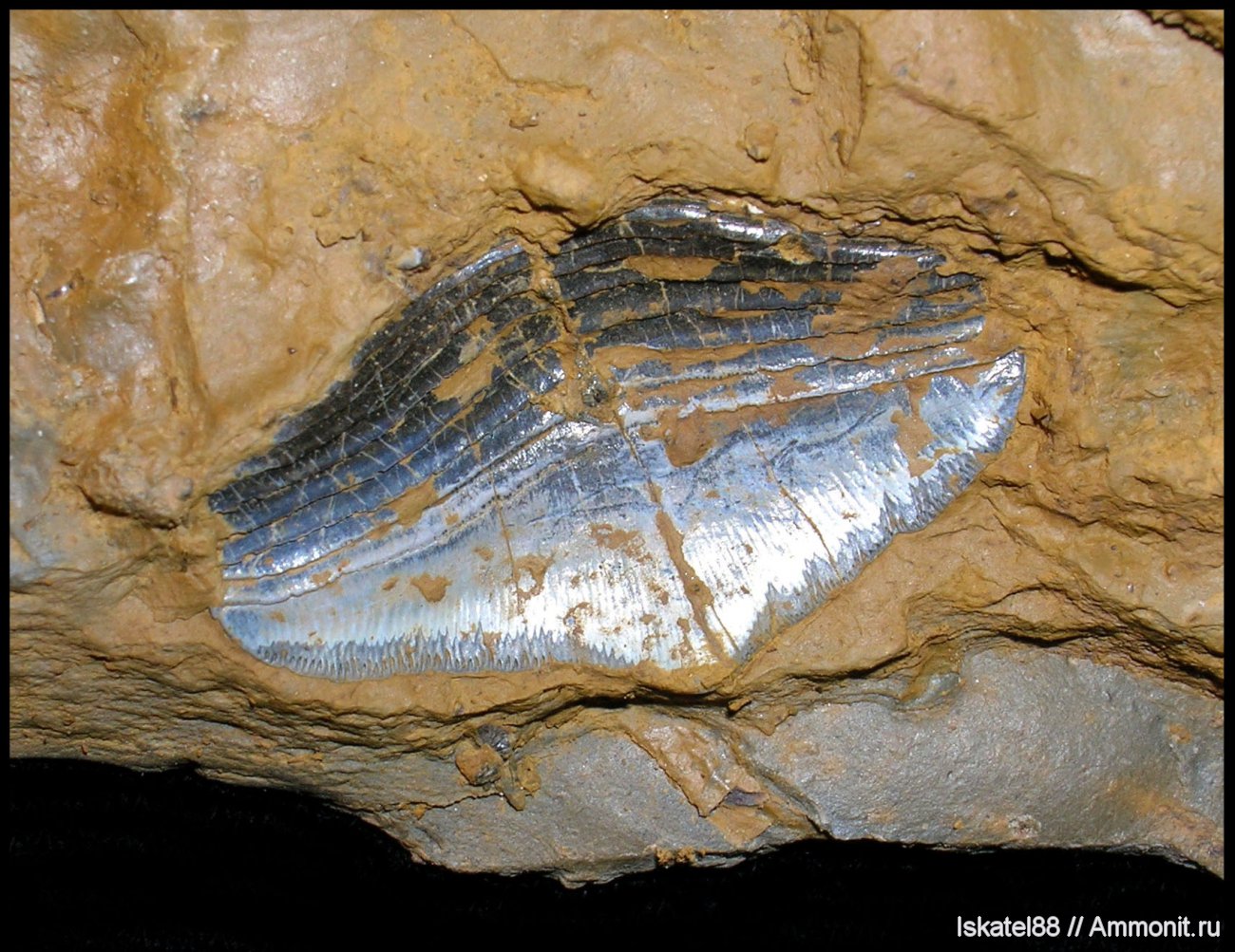 Коронка зуба с лингвальной стороны. Корень скрыт в породе.