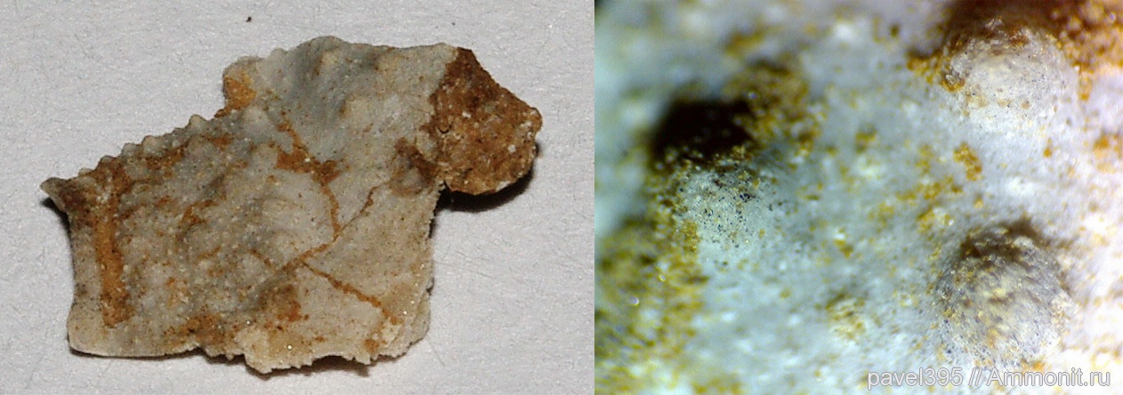 Из слоистого тонкого известняка Алексеевского карьера. Размера фрагмента (панциря) - 1 см, увеличение справа *64.