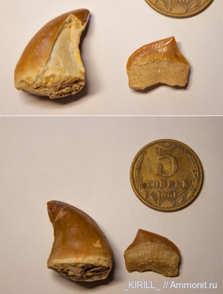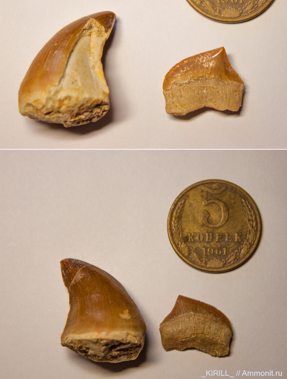 Зуб - Squalicorax pristodontus. Оба образца - Марокко, верхний мел - маастрихт. | ||||||