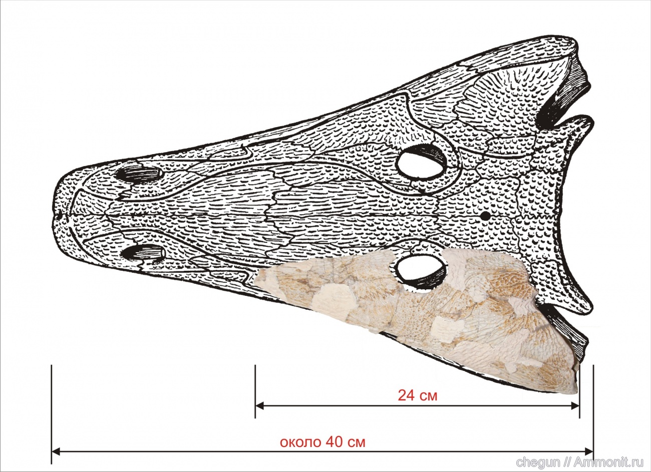 Мы с папой наложили фотографию фрагмента на рисунок черепа взрослого Benthosuchus sushkini ("BENTHOSUCHUS SUSHKINI EFR.-ЛАБИРИНТОДОНТ ИЗ ЭОТРИАСА РЕКИ ШАРЖЕНГИ", А.П.БЫСТРОВ И П.А.ЕФРЕМОВ, 1940, стр. 78, рис. 62). По нашим расчетам длина черепа была примерно 40 см, что соответствует длине лабиринтодонта примерно 1,5 м.