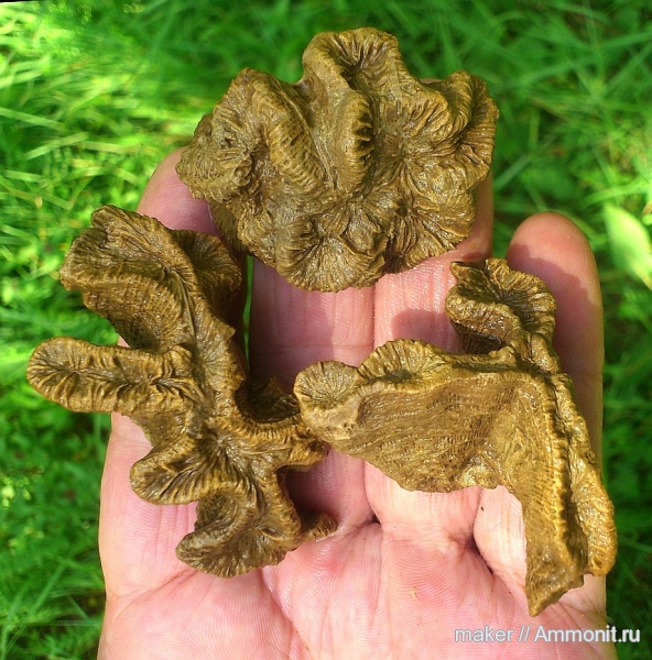 Думаю есть. Во всяком случае повторение формы я уже наблюдал. Их, видимо ещё, несколько видов. Даже на фото видно, что свержу и справа снизу совершенно разный вид имеют. Верхний - массивный сросток с одной ножкой, сплюснутый сверху. Только что такого вида малыша помыл))). А другие (правый снизу) - сплюснутые с боков, причем очень сильно с образованием разномастных крестов. У первых кораллиты крупные и широкие, у вторых - мелкие и цепочечные. Есть вообще варианты с кораллитом-лепестком, как средний левый... В общем есть куда ковыряться... | ||||||