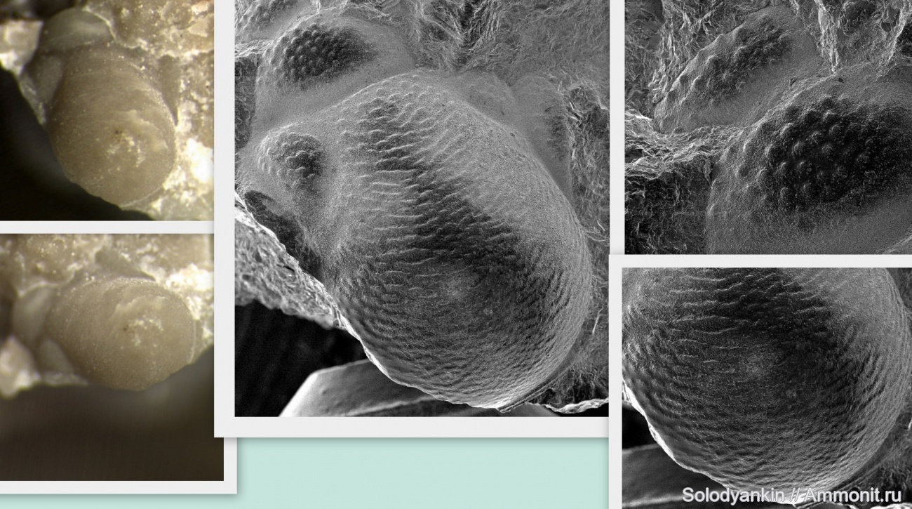 На первый взгляд казался гладким и невыразительным (на коллаже цветные фото с левого края, сделанные фотоаппаратом). Однако, поместив образец под сканирующий микроскоп удалось разглядеть тончайшую скульптуру, покрывающую всю поверхность остатка.
