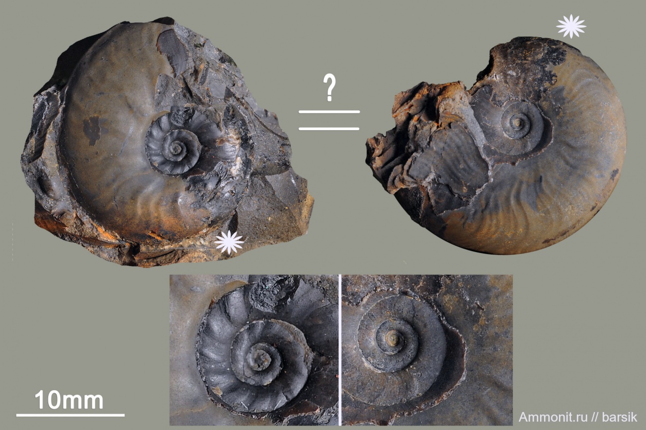 По его мнению, эти два аммонита при схожести общей формы раковины имеют разную скульптуру начальных оборотов: гладкую и груборебристую, но это не признаки разных видов, а внутривидовая вариабильность.
