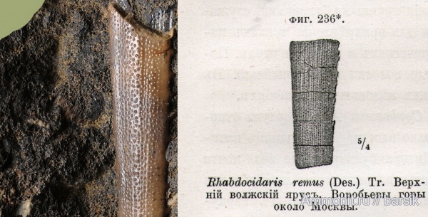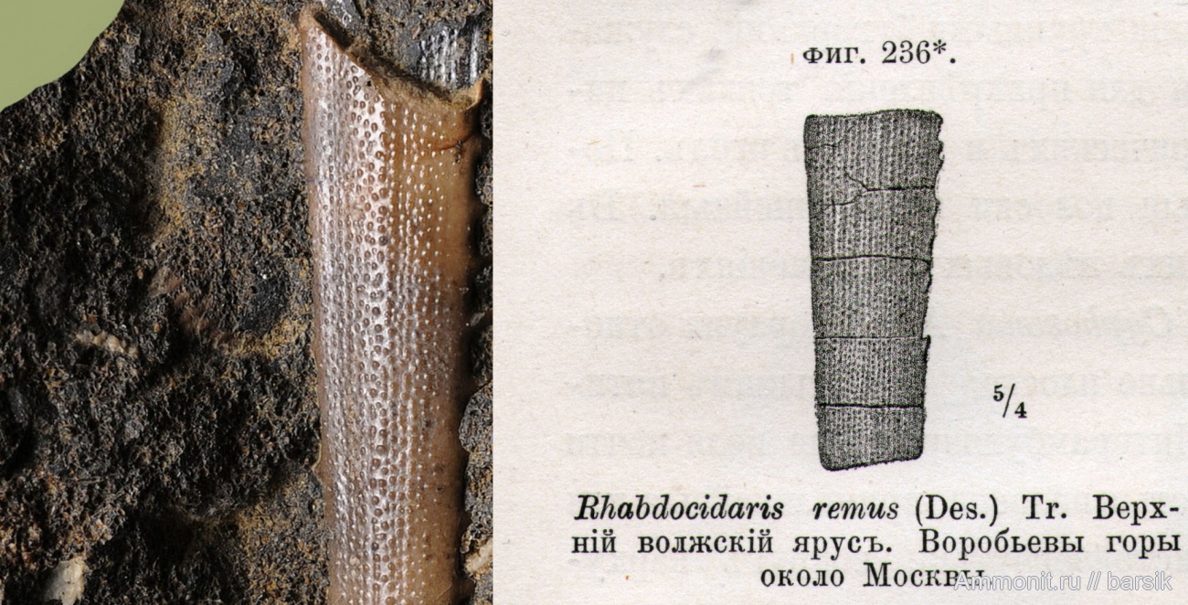 Прошло уже более ста лет, и сложно понять, что именно думал Лагузен. Однако ситуация мне кажется следующей. Когда я стал искать первоописание Rhabdocidaris remus, то тут неожиданно оказалось, что разные источники указывают разных авторов! Сам род Rhabdocidaris установил Эдуард Дезор в 1855. Именно он числиться и автором вида R. remus в приведенном рисунке у Лагузена, а также во многих других источников. Однако в сводке Дезора указанный вид не значиться! Кроме того в некоторых работах указывается что автор вида R. remus не кто иной, как Г.А. Траутшольд (например тут). Однако там указан более поздний год описания – 1861. В попытке разобраться я посмотрел эту работу Траутшольда (благо она есть на jurassic’е). И хоть там, там как впоследствии оказалось, Траутшольд неверно отнес окаменелость мшанки к морским ежам, он сам указывает в качестве автора вида R. remus - Дезора. В последней сводке, составленной моим коллегой Андреасом Крохом, оказалось, что вид R. remus установил не кто иной, как сам Лагузен в этом самом учебнике (см. 231)! Там же написано про ошибочное указание авторства вида и про то, что этот вид – синоним вида R. lahuseni Gerasimov.