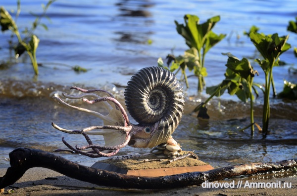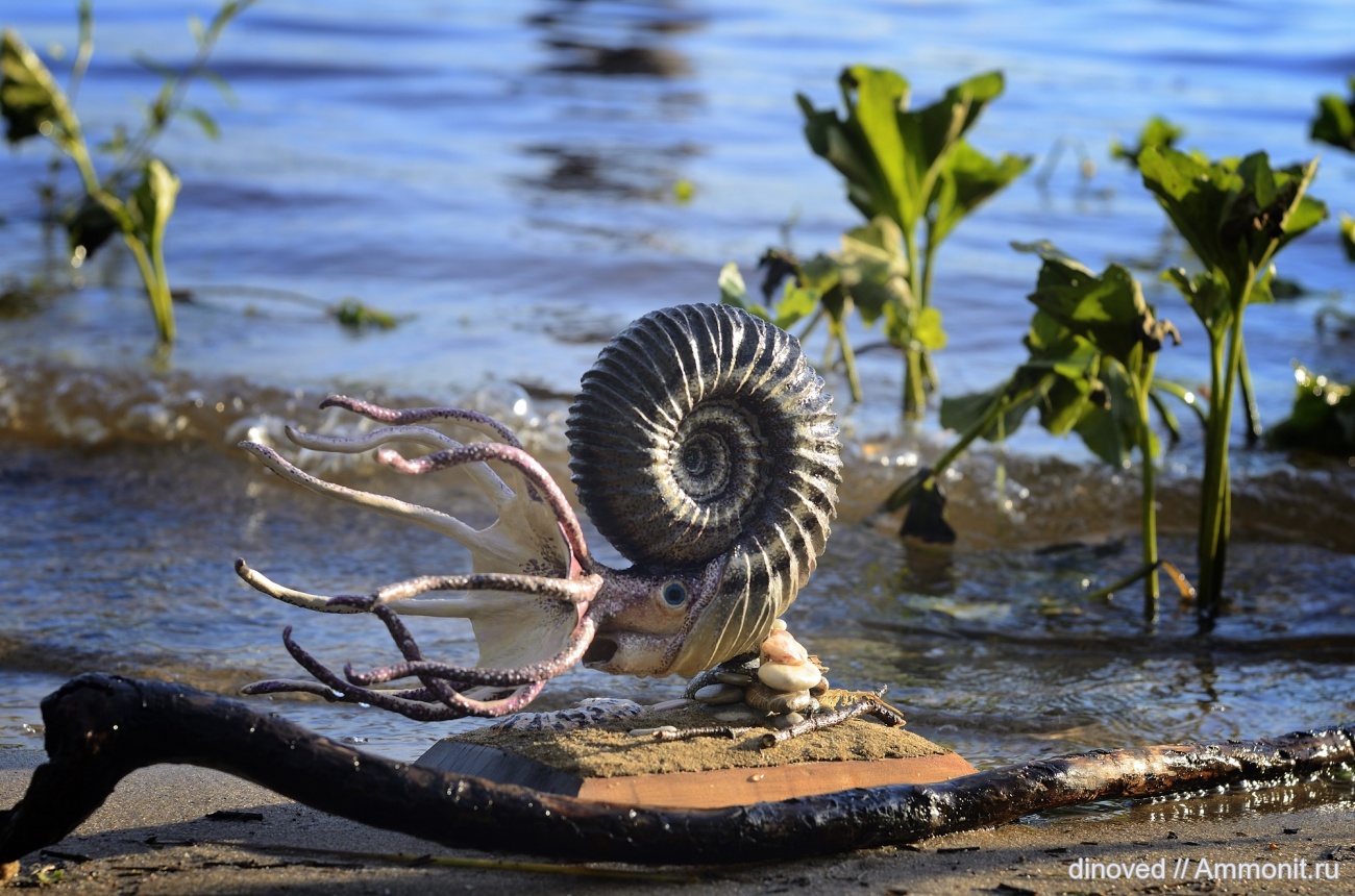Небольшая диорама с аммонитом рода Paracraspedites в натуральную величину. Раковина отлита из смолы по форме с реального образца из моей коллекции. Мягкое тело слепил из полимерной глины и запек в духовке. Затем роспись различными акриловыми красками. Размер раковины 130 мм., общая длина диорамы 240 мм.