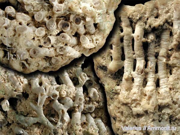 Колония сирингопоры в трех проекциях.В верхней части иногда просматриваются днища, на них опирался сам коралл занимая 3-4 мм на самом верху своей постройки. В средней части заметны мостики между коралитами и слои нарастания скелета.В нижней части колонии видно, как ветвится корал (оч похоже на его родственника аулопору). Клусово C2 mc.