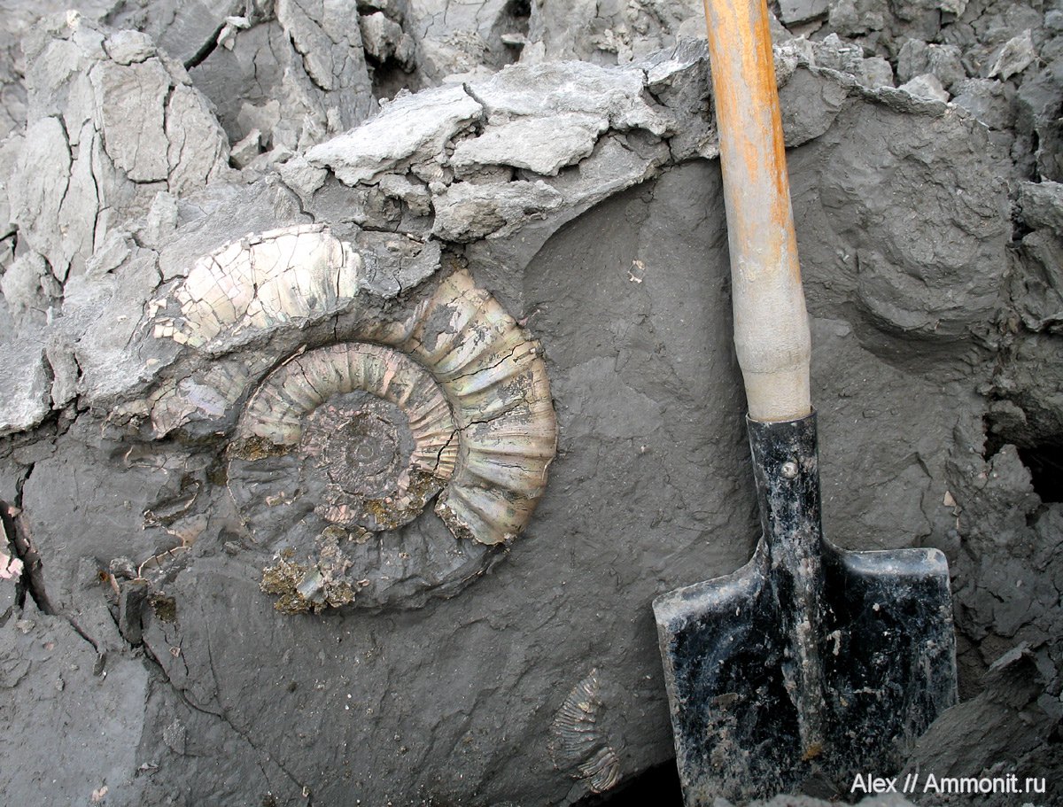 ...Йэээээх!!! Азартно. А я лет пятнадцать назад в Михайлове на Спартаке видел, как из ковша экскаватора выпал здоровенный кусок юрской глины метр на метр размером, раскололся, а внутри оказался огромный (саниметров сорок в диаметре) аспид (Aspidoceras), сверкающий розовым и зеленым перламутром... К сожалению, заполнение раковины было глиняным, взять не смогли (по неопытности)...