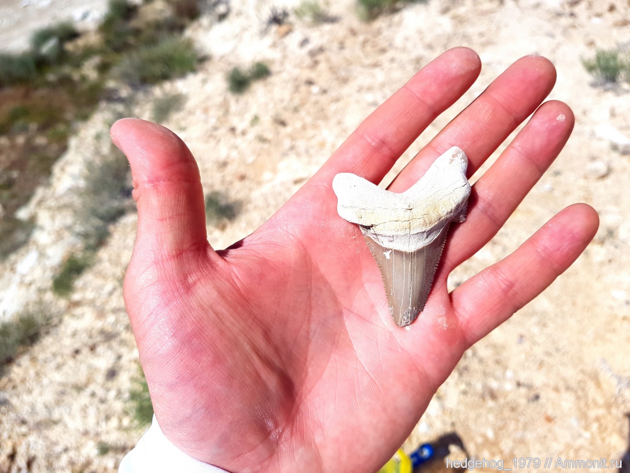 Зуб ископаемой акулы Otodus poseidoni poseidoni, найденный 30.05.2017. Местонахождение Усак, п-ов Мангышлак, Мангистауская обл., Казахстан. Возраст: палеоген, эоцен, бартон (41-37 млн. лет)