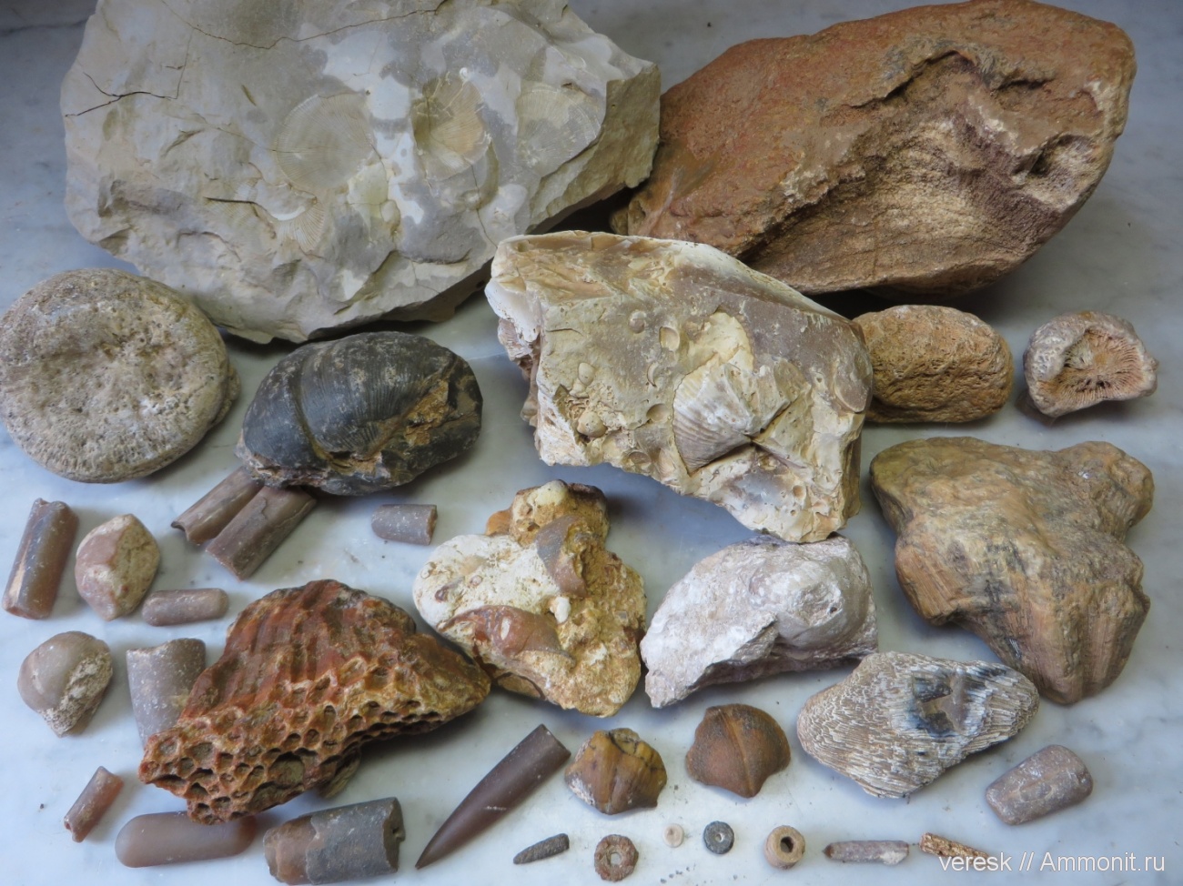 Ругоза, брахиоподы, морские лилии, белемнит, хететис, колониальный коралл Petalaxis, игла морского ежа.