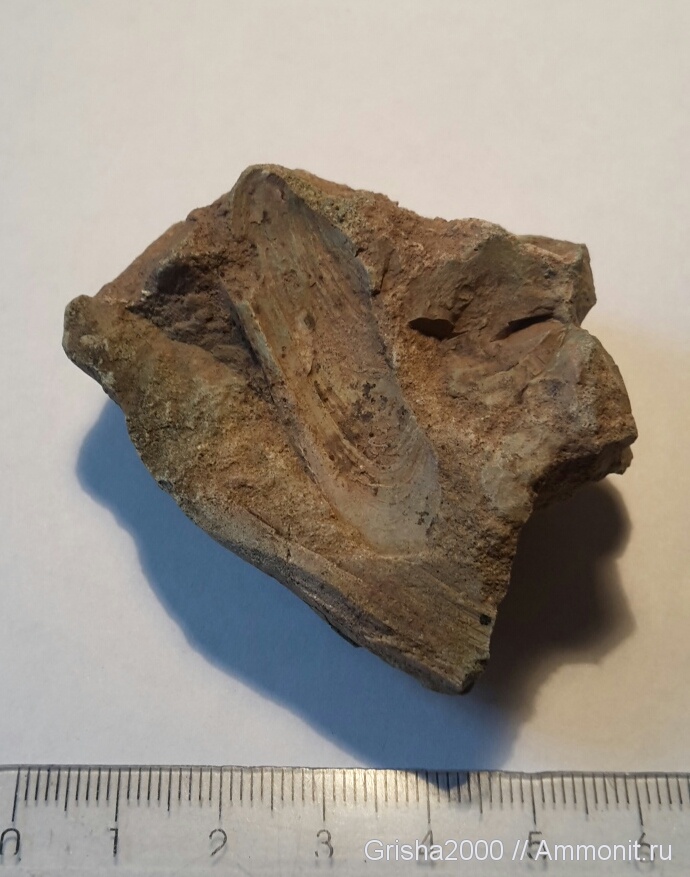 На обратной стороне образца видны следы зелени, что свидетельствует он наличии меди в породе. В бронзовом веке в этом месте разрабатывались медистые песчаники татарского яруса перми, благодаря чему в отвалах можно найти интересные с палеонтологической точки зрения образцы, которые для древних горняков не были интересны.
