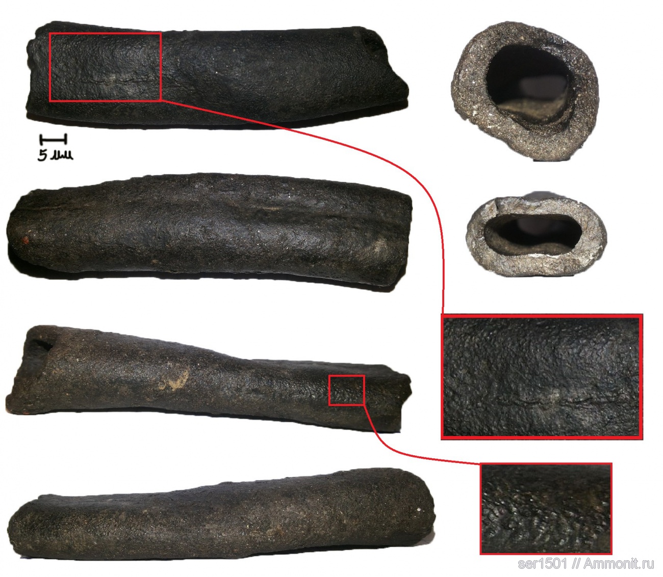 1) Губка. За : форма поверхности (гладкая с впадинками). Против : стенки слишком одинаковой и малой для губки толщины, по поверхности идет сросшаяся трещина, окаймленная с обоих сторон "бортиками" необъяснимая для губки, форма сечения внешней поверхности скорее характерна для кости. 2) Конкреция, образовавшаяся на стволике или кости. За : - . Против : я видел фото конкреций либо просто гладких, либо бугристых, но ни одной с гладкой поверхностью с впадинками; к тому же против образования на стволике свидетельствует овальная форма внутреннего канала; наконец, трещина на конкреции вроде не могла сама "затянуться". 3) Окаменевший фрагмент трубчатой кости. За : форма поверхности - гладкая с впадинками - характерна для костей; форма и толщина сечения характерна для кости; прижизненная сросшаяся трещина; Против : слом трубчатой кости должен иметь пористую структуру. 4) Слепок с кости (Кость растворилась в глинах, в образованной полости сформировалось минеральное отложение). За : см(3) и еще плюсом объясняется не пористая, а сплошная структура слома. Против : лично я не вижу аргументов "против" и склоняюсь к этому варианту, но на форуме ну не хотели признавать это ни костью ни слепком с кости. Сошлись на "вы сами решайте как это в своем собрании называть, а версии мы с вами можем придумывать бесконечно".