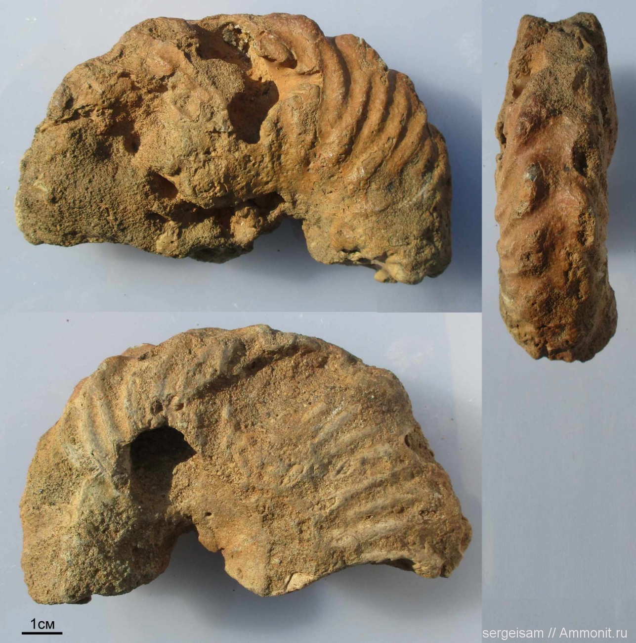 Образец не самой лучшей сохранности, но и ему приходится радоваться т.к. встречаются они очень редко. Это моя единственная находка Dimorphoplites-а. Диаметр аммонита 117мм. Определить до вида не могу. Из подобного разреза близь Парамонова на р.Волгуше Барабошкин с Михайловой описывали Dimorphoplites variabilicostatus (2 образца диаметром 20 и 30мм) и Dimorphoplites Beresovkaensis (2 образца диаметром 34 и 59мм). Возможно найденный мной принадлежит к одному из этих видов.