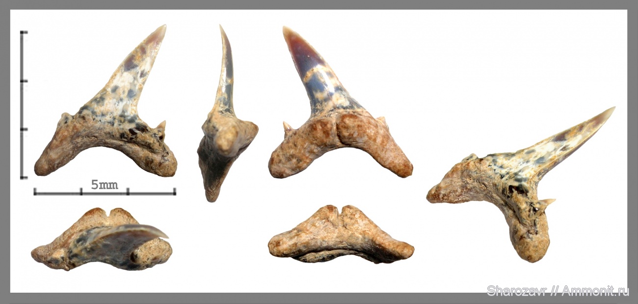 Должно быть Carcharias. Учитывая своеобразный наплыв коронки с лабиальной стороны, может быть Tobolamna, но про этот род мало известно, так что аномальный зуб тем более сложно определить. | ||||||