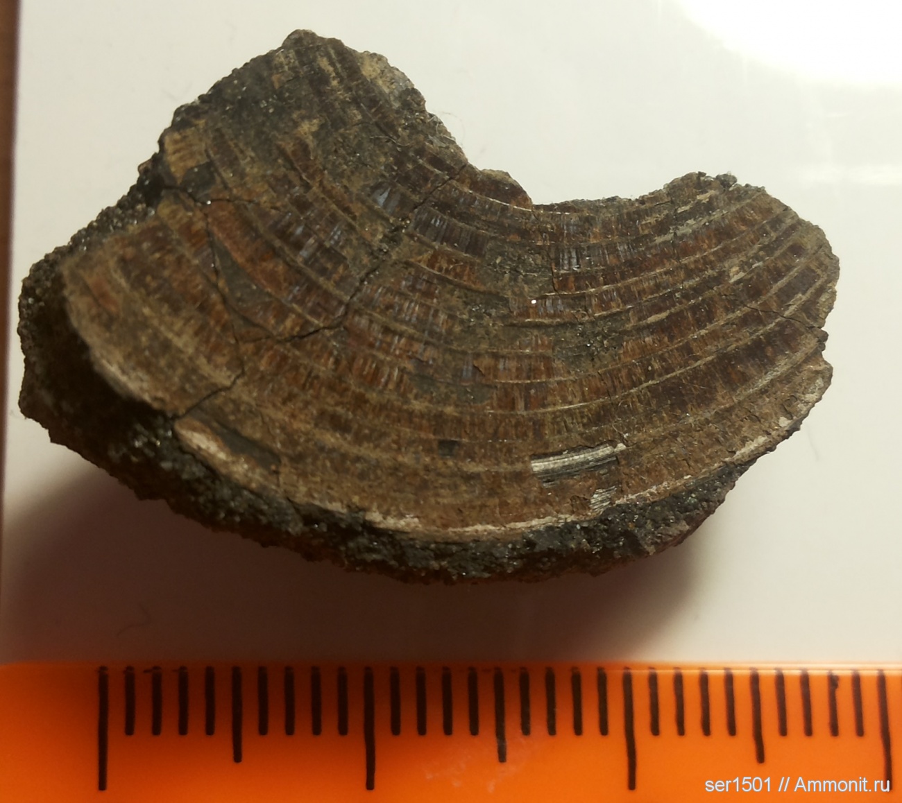 По-моему похоже на аптих. Под частично сколотым коричневым органическим слоем проглядывает тонкий частично растворенный кальцитовый. Хотя на "органическом" слое какие-то "перетяжки", а на фото аптихов я ничего подобного не видел (но и на фото двустворок тоже). Да и вроде в филях аптихов еще не находили. Так что наверное двустворка.