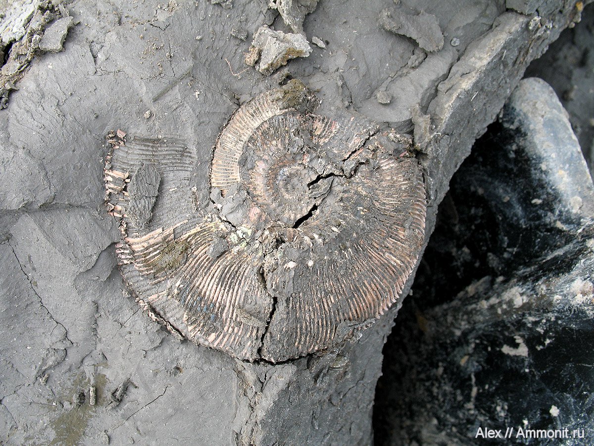 Раковина аммонита Kosmoceras phaeinum в породе - в глине келловейского яруса средней юры. К сожалению, даже в коренном залегании аммониты могут быть растресканы, часть раковины может быть не замещена пиритом, а просто растворена и заполнена глиной. У аммонита на фотографии только отколовшаяся часть (справа) пиритовая, все остальное - глина под слоем перламутра. Тем не менее, в только что вынутых из стенки карьера глинах, аммониты значительно лучшего качества, чем в отвалах, где под действием дождей они разваливаются и окисляются.