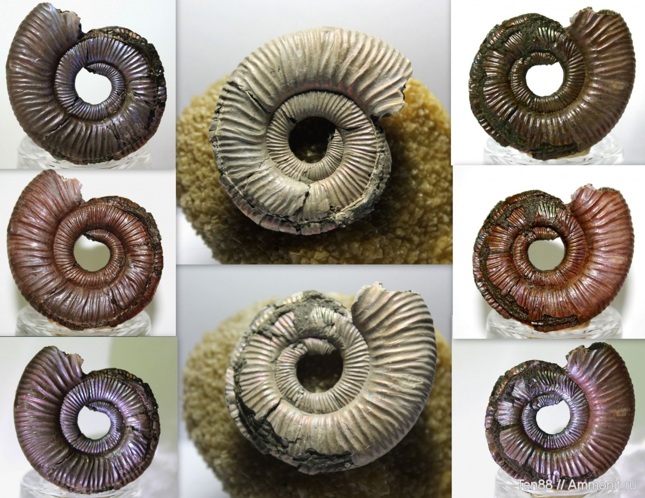 Надеюсь, что с названием угадала :))) Еще подарок от Галины - кравчик с наибольшим диаметром в 5,6 см. В центре фото он с двух сторон, а по бокам опять же с разной подсветкой. Как-то вот захотелось показать, какой разный может быть перламутр на одном и том же аммоните при разном свете. Еще данный образец имеет залеченное прижизненное повреждение Фото. А еще внутри пиритовая красота :) Фото