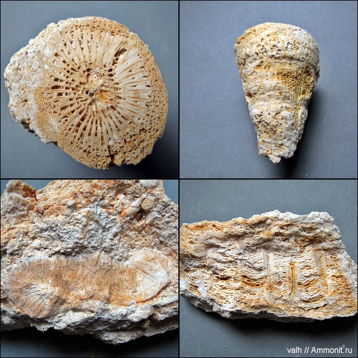 На фото вверху B.conicum,поперечный срез и кораллит. На фото внизу Chaetetes и маленькая колония Cystiphora manchurica(размер колонии 50 мм,хететеса 40 мм.Извлечены из слоя Ivanovia(I.)podolskiensis,гензоны Ivanovia,щуровской свиты,подольского горизонта.Слои с Ivanovia по прежнему доступны,в каждом блоке детритового известняка размером 40х40 см содержится несколько мелких колоний Cystiphora?(Ivanovia) средней сохранности,а также B.conicum,мелкие колонии Chaetetes,редкие мелкие колонии петалаксис плохой сохранности,а также иголки ежей,членики криноидов,брахиоподы ,губки и множество других мелких организмов.