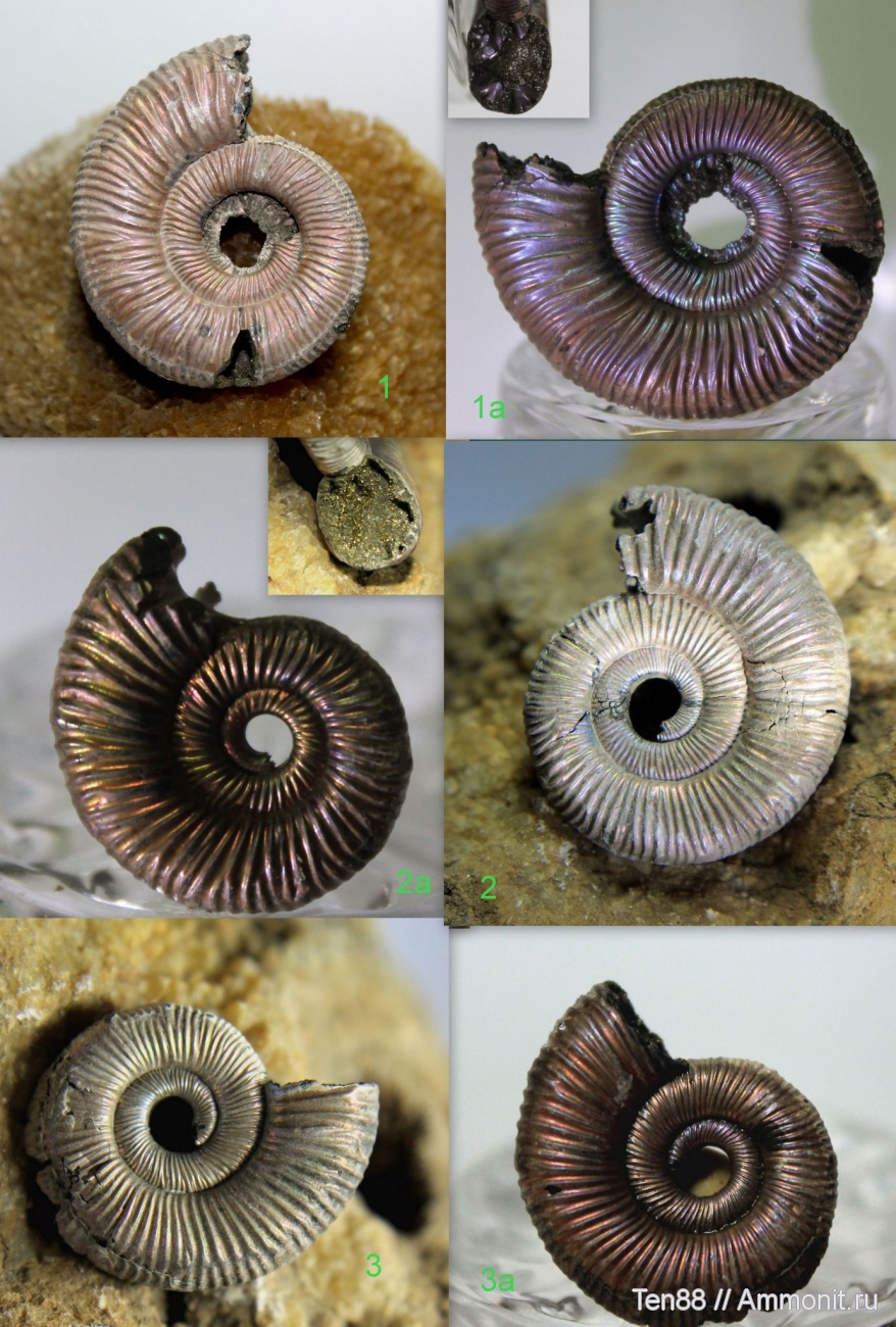 Еще подарки от Галины :) Целых три симпатяги Binatisphinctes cf. mosquensis. Размер 1 - 4,5 см, 2 - 3 см, 3 - 2,5 см. Внутри очень красивый пирит :)