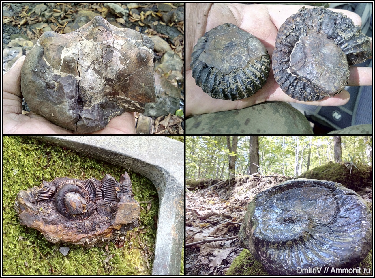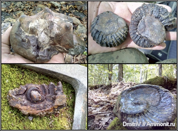 Хорошие находки! Аммонит справа на правом верхнем фото кажется слегка "гетероморфным", интересно было бы расчистить ранние обороты, обычно такая форма возникает при обрастании какой-то двустворки (если это не посмертная деформация). | ||||||